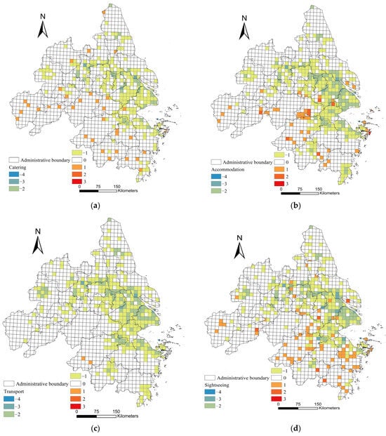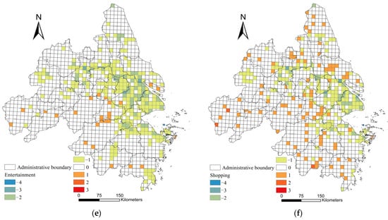 We measured the demand for nighttime activity in the urban agglomeration of the YRD using the NTL data. We measured the supply status of NSFs using tourist POI data. Based on fishing nets with 50 rows and 50 columns, we calculated the NTL data and the supply quantity of NSFs provided in the YRD urban agglomeration for each fishing net. Using natural breaks, we reclassified the data and divided them into five groups ranging from small to large. We assigned values of 1 to 5 to the data. After reclassification, we compared the NTL data score to the supply quantity of the NSF score (the reclassified score values of the NTL data minus the reclassified score values of the NSF supply quantity). (In Figure 7, because the range of values obtained by subtracting the reclassified score values of the NTL data from the reclassified score values of NSF supply quantity is between −4 and 3, the figure only depicts values within this range.) When the reclassified score values of the NTL data are greater than the reclassified score values of NSF supply quantity, the demand for NSFs exceeds the supply, referred to as the relative deficit area of NSFs. Conversely, when the reclassified score values of the NTL data are less than the reclassified score values of NSF supply quantity, the demand for NSFs is less than the supply; this is referred to as the relative surplus area of NSFs.