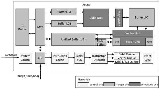 The typical NPU architecture is equipped with specialized hardware units that can directly perform matrix or vector multiplication and addition to accelerate neural network computations []. Take the Huawei Atlas200 AI accelerator module as an example; its built-in AI Core adopts the DaVinci architecture, as shown in Figure 1 [].