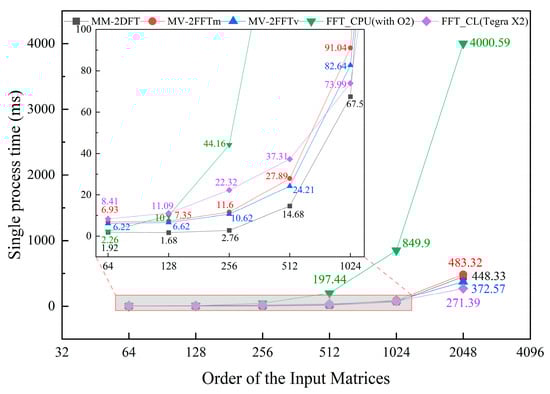 The experiment result showed that the execution time of MM-2DFT, MV-2FFT, FFT-CL, and FFT_CPU increased with the input scale but at different rates. In detail, the result demonstrated that MM-2DFT has the shortest processing time for most input sizes (64 × 64~1024 × 1024), while FFT_CL has the longest processing time with an input size under 256 × 256. As the input size increased, the gap between their runtimes progressively narrowed and eventually reversed. When the input size increased to 2048 × 2048, FFT_CL achieved the highest running speed among the three algorithms, surpassing the second place MV-2FFTv by 27%. Similarly, MV-2FFTv ran 16% faster than MM-2DFT for that input size. Additionally, FFT_CPU showed the second-best performance with the smallest input data size (64 × 64). However, its time consumption increased substantially on larger input data sizes, surpassing other algorithms. This suggested that other computing platforms may have significant advantages over the CPU for this task.