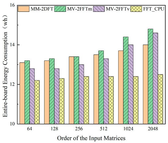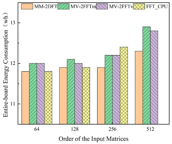 Figure 5 illustrates the trend of the total energy consumption of different algorithms as a function of the input matrix size when executed consecutively. According to the test results, those algorithms can be ranked by total power consumption in the following order from low to high: FFT_CPU, MV-2FFTv, MM-2DFT, and MV-2FFTm. In detail, the FFT_CPU algorithm incurred a mild increase in the board’s total power consumption as the input matrix size grew. In contrast, the board’s total power consumption of other tested algorithms, especially MV-2FFTm and MV-2FFTv, increased significantly with the input data size.