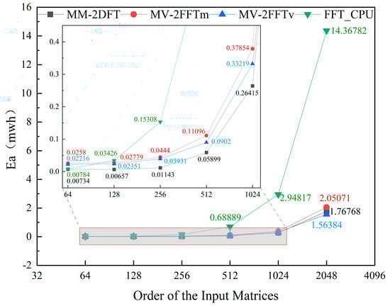 Figure 7 illustrates that the energy consumption of various algorithms generally increased as the order of input matrices increased, yet with different growth rates. Among these algorithms, MM-2DFT was the most energy-efficient overall. FFT_CPU showed low power consumption comparable to MM-2FFT when the input data size was equal to or lower than 128 × 128. However, its power consumption soared to the highest among all the evaluated algorithms when the input data size reached 256 × 256 or higher. Regarding the two implementations of MV-2FFT, MV-2FFTv was more energy-efficient compared to MV-2FFTm but still consumed more time than MM-2DFT on all tested input data sizes.