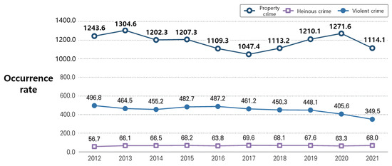 Trends in accrual costs by major criminal crimes of prosecution in 2012–2021. (Source: “2022 Crime Analysis” by the Supreme Prosecutors’ Office of Korea).
