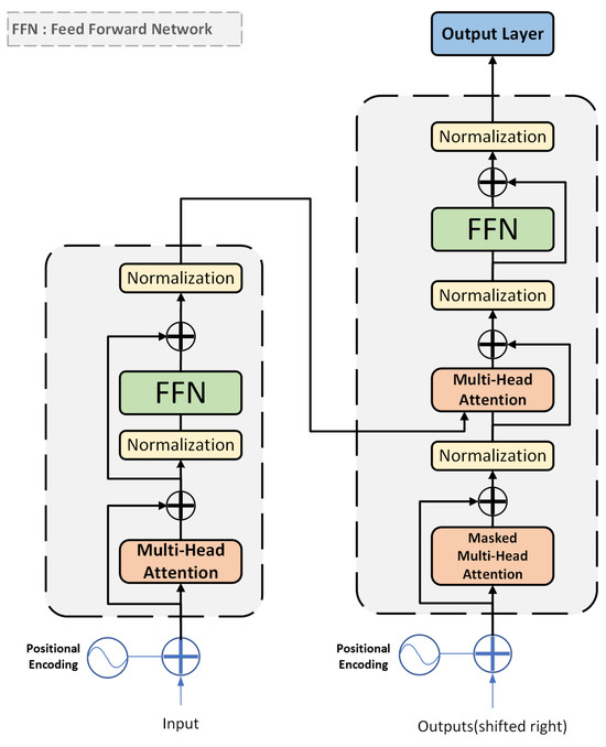 Transformers are architectures that are not based on an RNN structure but introduce self-attention and multi-head attention to the encoder and decoder parts. This integrates the advantages of self-attention and multi-head attention and has exhibited excellent performance in various natural language processing tasks, such as translation, document summarization, question and answer, and time series data processing. The basic structure of the Transformer is illustrated in Figure 2.