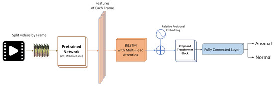 - Integration of BiLSTM with Multi-Head Attention for Temporal Dynamics: The second phase combines BiLSTM with multi-head attention, focusing on the temporal relationships between frame feature vectors. This synergy enhances the model’s ability to identify anomalies, leading to a marked improvement in detection accuracy.