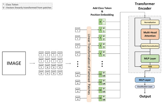 ViT was developed to apply the Transformer architecture, as explained in Section 3.1, to image data analysis. The core concept of ViT, as depicted in Figure 4, involves dividing the input image into a series of fixed-size patches. Before being used as input to the Transformer, each patch is flattened into a single dimension. Subsequently, the flattened patches have a ‘class token’ added, similar to the ‘CLS token’ that is added to sentences in Transformers. Additionally, position embeddings are added to each patch image to recognize the relative positions of the patches. These preprocessed patches are then fed into the Transformer encoder, which learns the relationships between the image features and the patches.