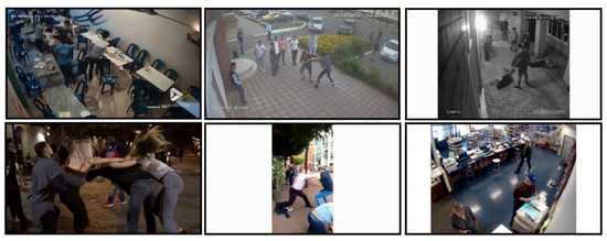 Real-world video data from CCTV and other security cameras are required for the performance verification and learning of the architecture proposed in this study. However, there are limitations to collecting and organizing large amounts of video data manually, and video data from security cameras, such as roads, individuals, institutions, and companies, are limited owing to various legal and ethical issues related to privacy and security. Therefore, we use the UBI-Fights [24], Hockey Fights [41], Movie Fights [42], and Crowd [43] datasets, which are widely used in anomaly detection research for training and verification purposes. UBI-Fights is a large dataset consisting of 80 h of videos, which includes 216 anomaly videos and 784 everyday scenes, totaling 1000 30 fps videos. The videos were stripped of unnecessary video segments (video introductions, news, etc.) that interfered with the learning process. The UBI-Fights dataset encompasses videos from diverse locations and includes various situations, captured across different times of the day and night. An example video is shown in Figure 6.