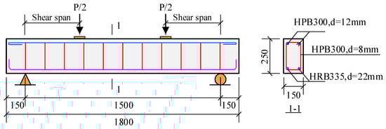 To validate the accuracy of the finite element modeling, an Abaqus model is created based on the experimental investigation of crack propagation patterns in reinforced concrete simply supported beams documented in the literature []. The test beams have cross-sectional dimensions of 150 mm × 250 mm, a total length of 1800 mm, and a calculated span of 1500 mm. The pads used in the experiment have cross-sectional dimensions of 150 mm × 60 mm × 20 mm. The reinforcement details are provided in Table 1 and the dimensions and reinforcement arrangement of the test beams can be seen in Figure 1, based on the results of the experimental study.