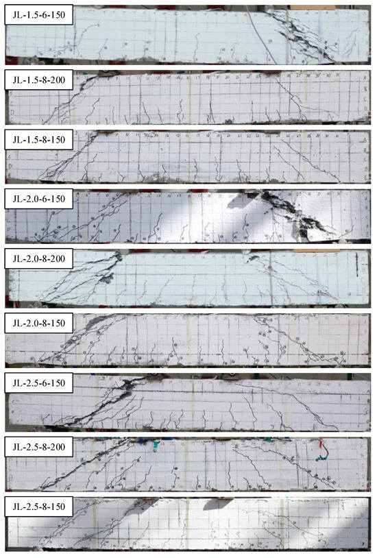 As shown in Figure 4, each test beam was damaged in shear-compression damage. Critical diagonal cracks were formed along the line between the loading point and the support, the concrete at the upper end of the diagonal cracks was crushed by the pressure, and obvious flexural deformation occurred. The cracks in the pure bending section in the span of the beam basically extended vertically upward but none of them developed to the top of the test beam. The cracks in the shear-bending section were more abundant and denser and intersected and penetrated each other to form a crack that ran through the height of the test beam.