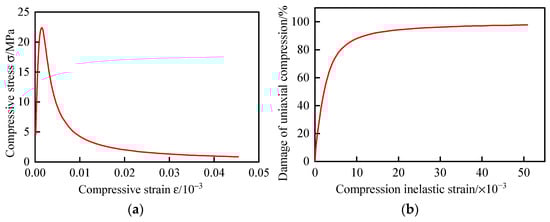 Figure 5 shows the stress–strain curves and axial compressive damage–strain curves of concrete under axial compression, respectively.