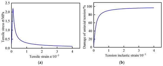 where represents the representative value of the axial tensile strength of concrete, which is taken as 2.2 MPa according to the code []; represents the descending parameter value of the axial tensile stress–strain curve of concrete, set as 1.53; is the peak tensile strain of concrete corresponding to the representative value of axial tensile strength , set as 0.0000998; and is the propagation parameter of concrete axial tensile damage.