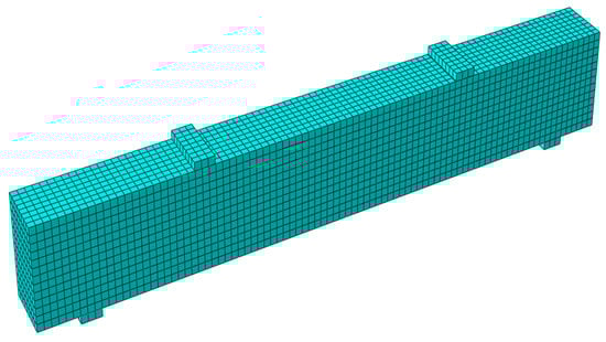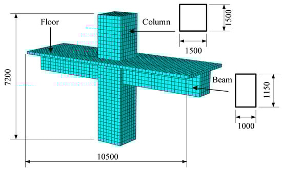 For Jinan Yao Qiang Airport, cracks of 0.5 mm in width are prone to appear at the end of beams in the 18 m-span joint area. In order to understand the development process and final failure pattern of cracks and then accurately control crack propagation, Abaqus simulation is carried out on typical beam–column joints in the M1 area. The section size of the joint beam in the research test is b × h = 1000 mm × 1150 mm, the section size of the test joint column is b × h = 1500 mm × 1500 mm, the total length of the joint is 10,500 mm, and the total height is 7200 mm. The grid division results of the model are shown in Figure 12.