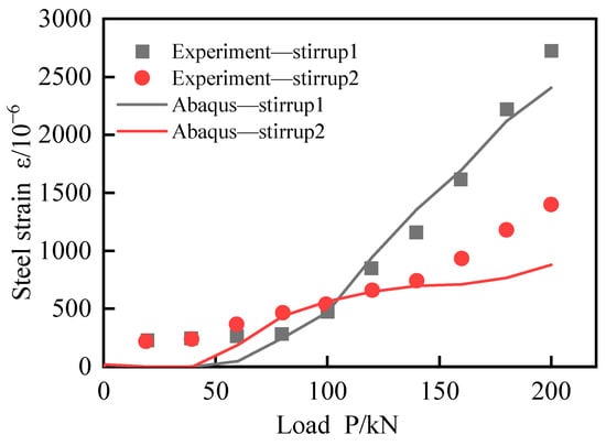 As the beam transitions into the stage of stable damage growth, the shear force is gradually transferred from the concrete to the stirrup, particularly when the bending shear inclined crack appears. As a result of the shear stress, the stirrup strain increases gradually. With the continued increase in shear force, multiple abdominal shear oblique cracks appear and their widths continue to expand. The shear force borne by the stirrup increases significantly and reaches a second inflection point where the stirrup strain increases rapidly. Figure 10 indicates that the strain at stirrup-1 agrees well with the test results; whereas, the strain growth rate at stirrup-2 is lower than the test results in the comparison between the original test and finite element simulation results but the trend remains the same.