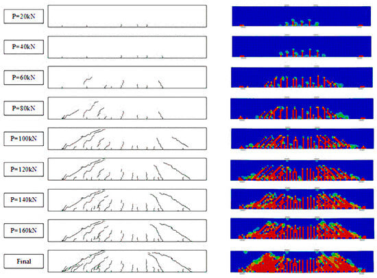 Figure 11 illustrates the damage process of the beam. At the stage of stable damage development, the small cracks appearing at the bottom of the beam bending section do not have a large increase in width, stabilizing at about 0.3–0.4 mm; however, the number of them keeps increasing, which results in a smaller spacing of the cracks and a denser crack region. The concrete plastic damage model, while useful for quantitatively deriving the percentage of concrete damage, may not fully capture the width, spacing, and depth of macroscopic cracks. However, it can qualitatively demonstrate the development direction and propagation process of cracks through the DAMAGET distribution. It provides quantitative information on the extent of concrete damage; a complementary qualitative assessment of crack development and propagation is facilitated by the DAMAGET distribution.