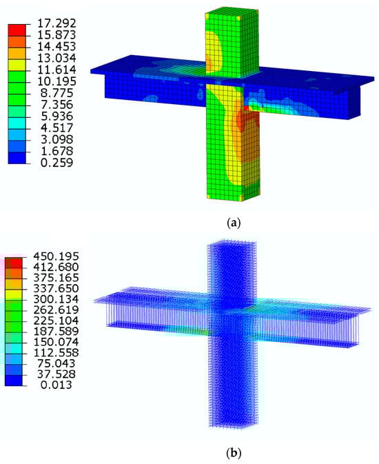 Stress distribution in reinforced concrete joints with floor slabs. (a) Stress distribution of the concrete joints; (b) Stress distribution of the steel reinforcement.