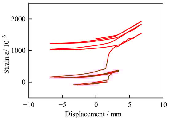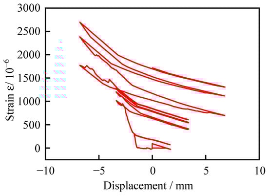 Take the upper longitudinal steel bar with a joint of 10 mm near the column edge. During the whole loading process, the longitudinal steel bar of the upper beam is strained under positive loading while the longitudinal steel bar of the upper beam is compressed under negative loading, as shown in Figure 17. The maximum strain value of the longitudinal reinforcement is 2000 × 10−6, which is lower than the yield strain, and the reinforcement has no yield.