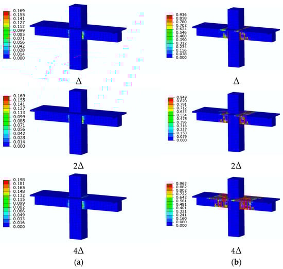 Regarding when the reciprocating load action was loaded to the maximum displacement, the stress of the concrete is shown in Figure 15a. The compression of concrete columns in the joint core area is more obvious when reciprocating loads are applied. From the von Mises stress distribution in the concrete joints, the concrete columns in the core region of the joints were subjected to more pronounced compressive stresses transmitted from the beam ends and the stresses were concentrated at the corners of the joints. That is, when the joint was loaded horizontally to the right, there was a significant compressive stress concentration area on the lower side of the column and the right-side beam. The upper side of the column and the left-side beam and floor slab, on the other hand, showed an area of compressive stress concentration. Figure 15b shows that under vertical reciprocating load, the absolute strain values of the longitudinal bars at the end of the beam joints with floor plates are relatively concentrated; thus, the anchorage length of the longitudinal bars at the end of the beam should be carefully considered in the structural design.