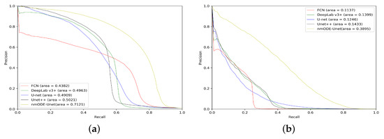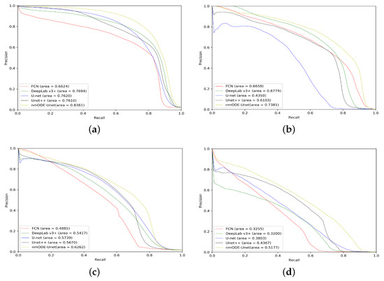 Through a detailed analysis of the data in Table 7, we can obtain the following results: (1) compared to [18], the AUPR score of nmODE-Unet is 8.66%, 2.68%, and 5.50% higher in the segmentation of EXs, SEs, and MAs, respectively, but 1.12% lower in HE segmentation; (2) compared to [20], the AUPR score of nmODE-Unet is 1.45%, 4.49%, and 2.97% higher in the segmentation of EXs, SEs, and MAs, respectively, but 6.07% lower in HE segmentation; (3) compared to [34], the AUPR score of nmODE-Unet is 4.51% and 4.42% lower in the segmentation of EXs and HEs, but 1.00% and 10.25% higher in the segmentation of SEs and MAs, respectively; (4) compared to [35], the AUPR score of nmODE-Unet is 3.14% and 1.27% lower in the segmentation of EXs and HEs, but 2.56% and 0.29% higher in the segmentation of SEs and MAs, respectively; (5) the method in [20] achieved the highest value in HE segmentation, the method in [34] achieved the highest value in EX segmentation, the method in [35] achieved the highest value in mAUPR, and nmODE-Unet achieved the highest value in SE and MA segmentation, respectively.