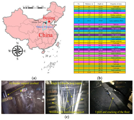 A realistic view of the strong mine pressure and geographical location of No. 8202 working face. (a) Location of Datong Mining Area; (b) strata columnar of No. 8202 working face; (c) support crushed, hydraulic prop topple and floor heave in roadway.