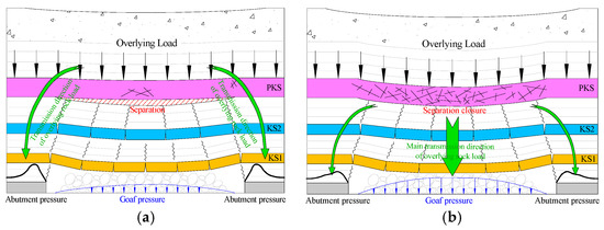 Influence of fracturing PKS on overburden load transfer and mining-induced stress distribution. (a) Load transfer path before PKS break; (b) load transfer path after PKS fractured.