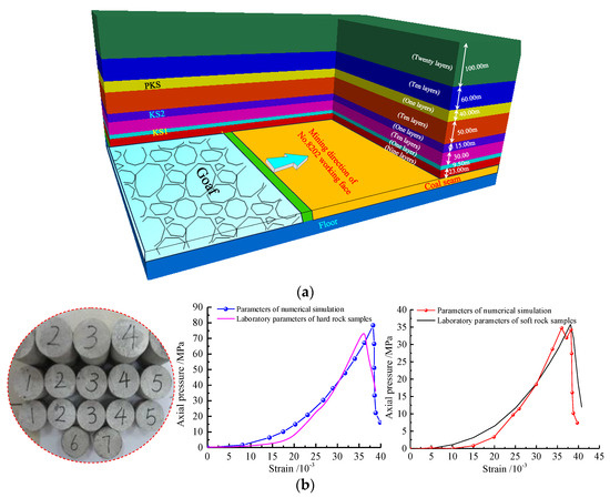 The displacement constraint is adopted for the surrounding and bottom boundaries of the model, the upper part is the free boundary, and a 150 m compensation load is applied to simulate the 500 m buried depth of the No. 8202 working face. To study the load-bearing characteristics of the key stratum and its separation effects before fracture, the aforementioned “move and remove method” is used to establish the contact surface. The overburden’s key stratum, floor, and coal seam adopts the Mohr–Coulomb model. Meanwhile, referring to the laboratory mechanical testing results of rock samples, the numerical simulation parameters were calibrated using the trial-and-error method [45,46,47]. Due to space limitations, taking hard rocks and soft rocks as examples, it can be seen that the numerical simulation parameters used can accurately reflect the bearing characteristics of different overlying strata, as shown in Figure 5b.