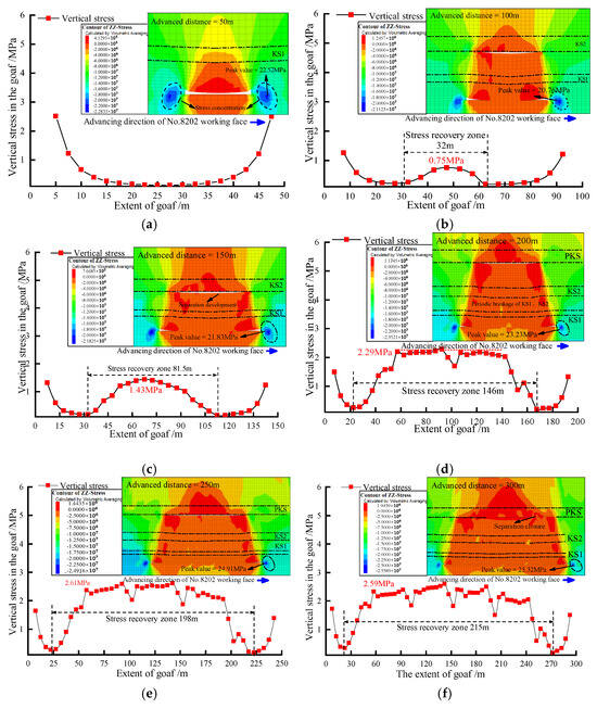 The corresponding goaf pressure and front abutment pressure with the advancing of the No. 8202 working face are extracted, and the vertical stress in the coal seam is selected as the monitoring indicator for the front abutment pressure. In contrast, the collapsed coal gangue in the goaf is updated to the Salamon model, and the vertical stress of the Salamon model is used as the goaf pressure, as shown in Figure 6. When the advancing distance is 50 m, the KS1 is not broken, the goaf stress is basically equal to zero, the stress concentration is formed at the working face, and the open–off cut and the peak value of the front abutment pressure is 22.52 MPa, as shown in Figure 6a. When the advancing distance is 100 m, the KS1 is broken, and KS1 and its controlled strata sink synchronously. At the same time, there is an uncoordinated deformation between KS2 and its underlying rock layer (that is, the strata controlled by KS1), and the separation appears. The width of the stress recovery zone in goaf is 32 m, the peak value of goaf stress is 0.75 MPa, and the peak value of the front abutment pressure is 20.76 MPa, as shown in Figure 6b. When the advancing distance is 150 m, the peak value of the goaf stress increases to 1.43 MPa, the width of the stress recovery zone rises to 81.5 m, and the peak value of front abutment pressure is 21.83 MPa, as shown in Figure 6c. When the advancing distance is 200 m, KS2 is broken, KS2 and its controlled rock layer sink synchronously, the peak value of the goaf stress increases to 2.29 MPa, the width of the stress recovery zone rises to 146 m, and the peak value of the front abutment pressure is 23.23 MPa, as shown in Figure 6d. When the advancing distance is 250 m, the peak value of the goaf stress further increases to 2.61 MPa, the width of the stress recovery zone rises to 198 m, and the peak value of abutment pressure is 24.91 MPa, as shown in Figure 6e. When the advancing distance is 300 m, the peak value of the goaf stress further increases to 2.59 MPa, the width of the stress recovery zone rises to 215 m, and the peak value of the abutment pressure is 25.32 MPa, as shown in Figure 6f.