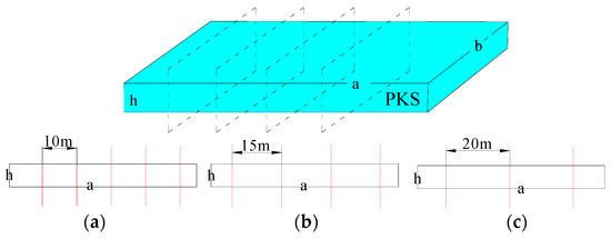 A large number of engineering practices show that fracturing in the high-level key stratum is an effective means to alleviate the intensity of strong mine pressure behavior [48,49], and the different fracturing schemes of the high-level key stratum also have a significant impact on the distribution of the front abutment pressure and the goaf stress. Taking the advancing distance 250 as an example, those mentioned above in the “Separate + interface” method are used to cut the PKS to form different crack schemes artificially. Then, the corresponding change patterns of the front abutment pressure and the goaf stress are investigated. The method of vertical cracks with different spacing to cut PKS is shown in Figure 7.