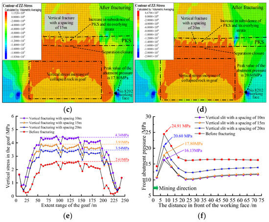 The corresponding distribution curve of the front abutment pressure and the goaf stress are shown in Figure 8. When the PKS is not fractured, the peak value of front abutment pressure is 24.91 MPa, as shown in Figure 8a, the width of the stress recovery zone in the goaf area is 198 m, and the peak value of goaf stress is 2.61 MPa, as shown in Figure 8e,f. After fracturing the PKS with a vertical crack spacing of 10 m, the peak value of front abutment pressure is reduced to 16.13 MPa, as shown in Figure 8b. In comparison, the width of the stress recovery zone in the goaf area is increased to 220 m, and the peak value of goaf stress is increased to 4.34 MPa, as shown in Figure 8e,f. After fracturing the PKS with a vertical crack spacing of 15 m, the peak value of the front abutment pressure is reduced to 17.80 MPa, as shown in Figure 8c, the width of the stress recovery zone in the goaf area is increased to 217 m, and the peak value of goaf stress is increased to 3.91 MPa, as shown in Figure 8e,f. After fracturing the PKS with a vertical crack spacing of 20 m, the peak value of the abutment pressure is further reduced to 20.60 MPa, as shown in Figure 8d, the width of the stress-recovery zone in the goaf area is increased to 215 m, and the peak value of goaf stress is increased to 3.54 MPa, as shown in Figure 8e,f.