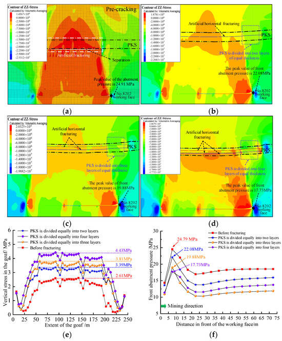 Based on those above-mentioned high-level key stratum cutting simulation methods, the high PKS is also cut with different thicknesses of horizontal fractures; the horizontal fracture cutting scheme is shown in Figure 9, in which PKS was divided into two/three/four layers through one/two/three horizontal fracture surfaces. The distribution of the mining-induced stress is shown in Figure 10a–d, respectively, and the corresponding front abutment pressure and goaf stress are shown in Figure 10e,f.