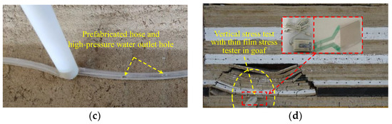 Model 1 is a control group in which the key strata are not fractured, as shown in Figure 11a. Model 2 is the experimental group in which the key strata will be fractured before mining, and an embedded hose with holes is placed in KS2 and KS3 in the production process. Red water is injected into KS2 and KS3 through the grouting pump through the small hole on the hose, which can simulate the weakening effect of the key strata, as shown in Figure 11b,c. During this process, the flow rate of the injected water is constant to realize the weakening effect on the material parameters of the key stratum. On this basis, the thin film stress distributed sensor monitors the goaf stress after the overlying strata collapse. The stress test film size is 6 cm × 6 cm, the size of a single measurement point microelement is about 1.5 mm × 1.5 mm, and the distribution density of stress test points is 36/cm2. The range of a single stress measurement point microelement is 1000 Pa, and 1600 stress measurement points are integrated with a test film, as shown in Figure 11d. The weakening effect of key strata fracturing on mine pressure behavior is analyzed by comparing the fracture characteristics of key strata and the goaf stress in models 1 and 2.