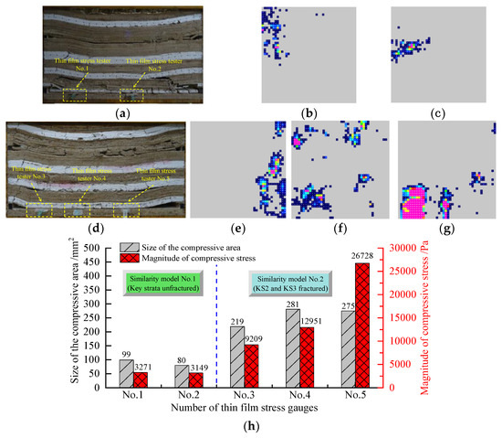 The strata movement results of the two models are shown in Figure 13, and the goaf stress is extracted according to the thin film stress gauge. The results show that in model 1 without hydraulic fracturing, the total number of stress measurement points with data is 99 in thin film stress gauge No. 1, as shown in Figure 13b, the total compressive area is about 222.75 mm2, and the combined pressure value is 3271 Pa. The total number of stress measurement points with data is 80 in thin film stress gauge No. 2, as shown in Figure 13c. The total compressive area is about 180 mm2, and the combined pressure value is 3149 Pa. In the fractured model 2, the total number of stress measurement points with data is 219 in thin film stress gauge No. 3, as shown in Figure 13e, the total compressive area is about 492.75 mm2, and the combined pressure value is 9209 Pa. The total number of stress measurement points with data is 281 in thin film stress gauge No. 4, as shown in Figure 13f. The total compressive area is about 632.25 mm2, and the combined pressure value is 12,951 Pa. The total number of stress measurement points with data is 275 in thin film stress gauge No. 5, as shown in Figure 13g. The total compressive area is about 618.75 mm2, and the combined pressure value is 26,728 Pa. It can be seen that the overlying rock layer collapses more fully after the key strata are fractured; the overlying load is transferred more to the collapsed rock in the goaf area, which is consistent with the above-mentioned numerical simulation results.