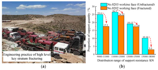 Given the problem of controlling the strong mine pressure behavior of the No. 8202 working face, ground hydraulic fracturing on high-level key stratum is carried out, as shown in Figure 14a. At the middle of the No. 8202 working face, the fracturing well is drilled vertically downward from the surface to the fracturing high-level key stratum. The drilling hole is first drilled from the surface to a stable bedrock section of 10 m by a Φ311 mm drill bit, which is followed by a Φ244.5 mm × 8.94 mm casing, a Φ215.9 mm drill bit drilled to the end, and a Φ139.7 mm × 7.72 mm casing. The first perforation and fracturing are carried out in the high key stratum with a total thickness of 39.15 m. Multiple small holes are first perforated in the entire thickness of the PKS so that the fracturing fluid can expand through the small holes to achieve fracturing. Fracturing is mainly divided into two steps as follows. Firstly, the initial fracturing is carried out by 50 m3 acid; the acid composition is 12% HCl + 5% HF. The acid solution’s strata dissolution reduces the rock’s mechanical properties and promotes the splitting and propagation of the high-pressure acid in the fracture. Secondly, nearly 510.0 m3 of water containing about 10 m3 of quartz sand with a particle size range of 0.225~0.45 mm is used to fracture the key strata further, which has a vital role in enhancing the fracturing effect, effectively supporting the crack propagation and preventing the crack from closing. The resistance of the hydraulic support of the No. 8202 working face and No. 8203 working face are shown in Figure 14b, respectively. It can be seen that the front abutment pressure of the No. 8202 is significantly smaller than that of the adjacent No. 8203 working face with the high key stratum unfractured. This engineering practice, which has also been mentioned in the literature [51], has provided substantial proof that key strata fracturing can effectively weaken the mine pressure behavior.