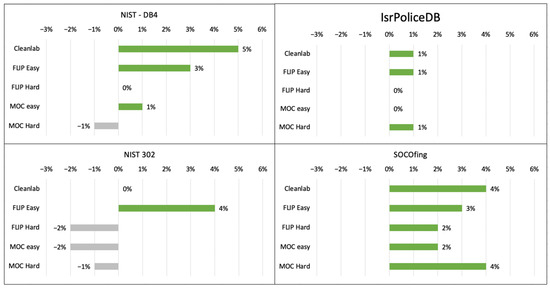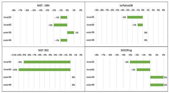 As can be seen in Figure 2, a 4% decrease is seen when classification is based on the inner region of the fingerprint. In contrast, when classifying based on the outer region, accuracy is usually not affected—with one exception, in the NIST-DB4, which showed a 1% drop/decrease; all other cases either improved or remained unchanged. These results indicate that the outer region of a fingerprint is more significant for gender classification, which is in accordance with previous literature findings. This is further supported by the absence of “delta” elements and additional features in the outer region that do not interfere with “ridge counting”.