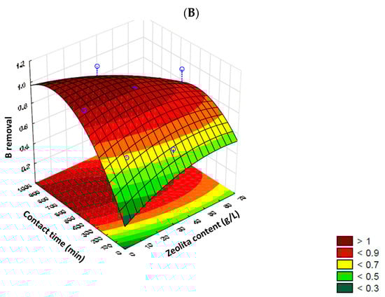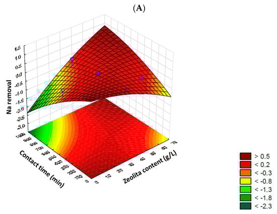 The 3D response surface plots are shown in Figure 1, once again highlighting the differentiated response of each cation. The maximum sodium removal values were established at around 50% with a zeolite content of up to 10 g/L or between 60–70 g/L, and a contact time of up to 100 min or between 800–1000 min, respectively. However, with a zeolite content of up to 35 g/L and a contact time exceeding 500 min, potential desorption and/or release of sodium by the zeolite was observed, resulting in negative removal values. This situation was observed again with a shorter contact time, up to 200 min, but a higher zeolite content (<55 g/L). Removal of boron, on the other hand, showed a higher response when longer contact times were applied (between 600 and 800 min), displaying a central zone of high removal (> 95%), with a zeolite content of up to 50 g per liter. However, according to Figure 1B, contents ≤ 20 g of zeolite/L allowed for maximum boron removal (100% removal). In all scenarios, with low contact times (≤300 min), the removal efficiency was significantly impacted.
