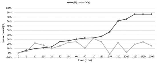 At various predefined times, each Erlenmeyer flask was opened for sampling and monitoring of cation concentrations. A total of 17 tests were conducted. Before the characterization analyses, the aqueous samples were filtered with cellulose acetate filters of 0.20 µm and 47 mm in diameter (Teknokroma, Barcelona, Spain). The percentage removal of sodium and boron was determined using Equation (1), where C0 and Ct represent the initial concentration of cations and the concentration at time t (mg/L), respectively.