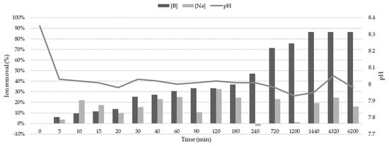Water samples’ pH variation as a function of contact time with zeolite and its correlation with the percentages of boron (B) and sodium (Na) cation removal.