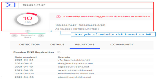 The detection system using ML learns the executable file for the PE (portable executable) structure in the form of EXE and DLL [11]. The PE structure is the file structure of the executable downloaded from the website, which can also be checked for similarities to malware. Additionally, it learns nonexecutable (Non-PE) structures such as standard document files and scripts. As shown in (Figure 4), this analysis checks the similarity of files hidden on the website to be inspected for maliciousness. For example, when checking the website IP registered on Google Virustotal, it can be seen that more than 30 phishing domains are registered [12].