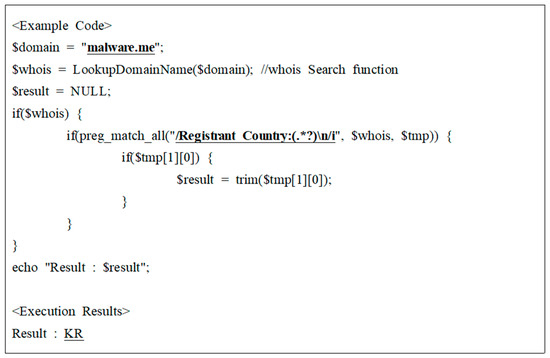 Information for determining the risk of a website can collect essential information through DNS. As shown in Figure 6, the country, registrar, registration date, end date, registration agent, and name server information is collected through Whois queries. This is to be able to check in advance whether the website is dangerous through basic information. Collecting DNS public information on the website through Whois queries is possible through a string for each keyword when inquiring Whois. For example, to extract a domain country, it can extract it using “Registrant Country”. “Reglstrant Country:(.*?)\n/I” means a search for a pre-registration area for a website domain.