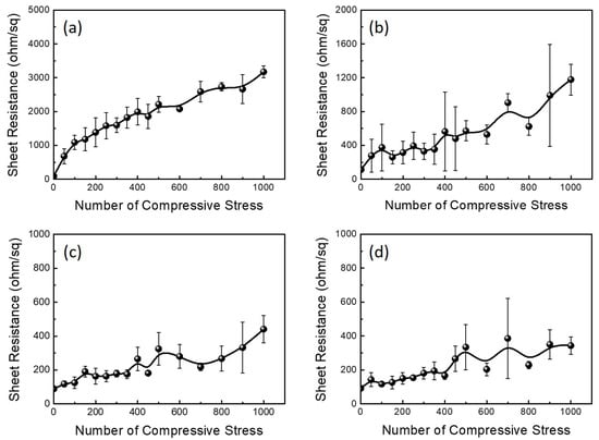 Sheet resistance of (a) ITO electrode on a PET film, (b) AgNW-exposed electrode on a PET film, (c) AgNW-embedded electrode inside NOA63 and (d) AgNW-embedded electrode inside NOA71 depending on the number of compressive stresses. The bending radius was 4 mm.