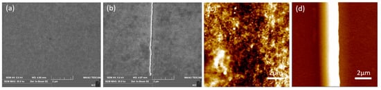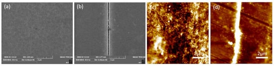 (a,b) SEM and (c,d) AFM images of the AgNW-exposed electrode on a PET film (a,c) before and (b,d) after applying tensile stress. The RMS roughness values before and after applying tensile stress were 9.8 nm and 9.4 nm, respectively.