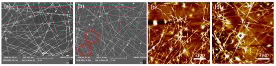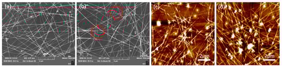 (a,b) SEM and (c,d) AFM images of AgNW-exposed electrode on a PET film (a,c) before and (b,d) after applying compressive stress. The RMS roughness values before and after applying compressive stress were 9.8 nm and 12.9 nm, respectively.