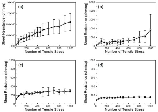 Sheet resistance of (a) ITO electrode on a PET film, (b) AgNW-exposed electrode on a PET film, (c) AgNW-embedded electrode inside NOA63 and (d) AgNW-embedded electrode inside NOA71 depending on the number of tensile stresses. The bending radius was 4 mm.