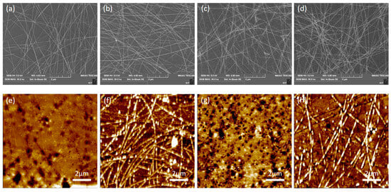 (a–d) SEM and (e,h) AFM images of the AgNW-embedded electrode in (a,b,e,f) NOA63 and (c,d,g,h) NOA71 (a,c,e,g) before and (b,d,f,h) after applying tensile stress. The RMS roughness values of AgNW-embedded electrode in NOA63 were 3.7 nm and 4.8 nm before and after applying tensile stress, respectively. The RMS roughness values of AgNW-embedded electrode in NOA71 were 1.6 nm and 2.5 nm before and after applying tensile stress, respectively.