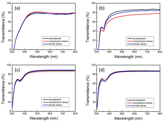 Optical transmittance of (a) the ITO electrode on a PET film, (b) the AgNW-exposed electrode on a PET film, (c) the AgNW-embedded electrode inside NOA63 and (d) the AgNW-embedded electrode inside NOA71 depending on the number of compressive or tensile stresses. The bending radius was 4 mm.
