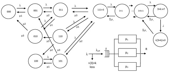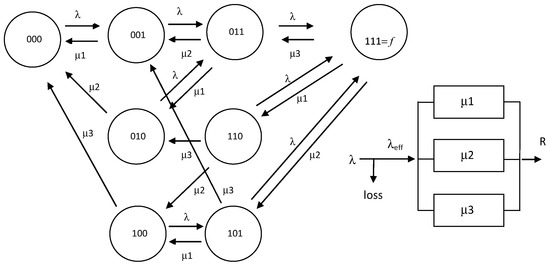 The results indicate that the description of the system states and their probabilities should take into account not only the states of the servers but also the associated allocation of all the arrivals and the different independent states in order to be considered a product form the set of state probabilities that sum to 1. In addition to the server’s busy state (111), the lost customers enter the loss server. In the transitions diagram of model B, >(111) = b is a state of full size for the servers. The system transits into the state >(111) with the rate λ when the arrivals overflow the servers, and the net input into the servers is λeff, while the rate through the loss server is λ − λeff. Based on the PASTA property, the split of the Poisson rate for all the servers, including the loss server, remains a Poisson distribution [1]. Based on [36], the net output rate through the loss server, which includes a queue of infinite capacity, is also λ − λeff, providing that the service rate of the loss server is greater than λ − λeff. This loss server has infinite capacity and we associates an arbitrarily sufficient high service rate >(λ − λeff) to comply with it. Finally, the total output of the whole system is λ, with the sum of the servers and loss server together.