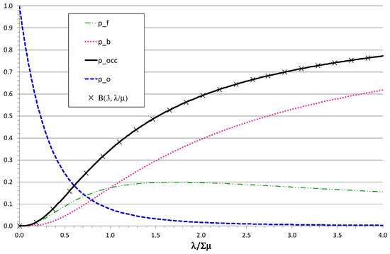 Model B considers heterogeneous servers, whereas the Erlang model M/M/k/k just with k identical servers is a particular case. In this case, the full system state can be described properly by λeff = λ(1 − pbusy) using (1) and (2); the results are included in Table 1. The results of model B for (k = 3, μ1 = μ2 = μ3 = μ = 1) of identical servers were also those of the Erlang-B formula. It resulted in pbusy = B(3,λ/μ) in Figure 3, but it was also verified using the numerical values, which were identical to 15 decimal places.