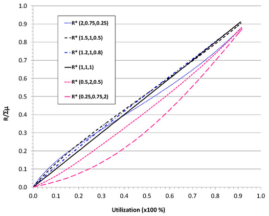 With a slight imbalance, some extra throughput was obtained when the order from faster to slower was applied, but when the imbalance was high—see, for instance, (2, 0.75, 0.5)—the benefit could only be obtained under medium to low utilization (low arrival rate). The system underperformed for the balanced service rates (1, 1, 1) with the same average for high utilization. When the utilization tended to saturation (see Figure 6 over 90% utilization), the throughput was quite similar, attenuating the effect of the server’s arrangement. However, for a given average arrival rate of the mean service time, the maximum throughput was reached by homogenous (1, 1, 1) or slightly heterogeneous servers. A high imbalance in service rates reduced the throughput. As a rough estimation, reductions up to the order of 5% in R* = R/Σμ can be observed in Figure 6, depending on the pattern of multiclass servers that caused significant heterogeneity for the performance and not only the average of service rates.
