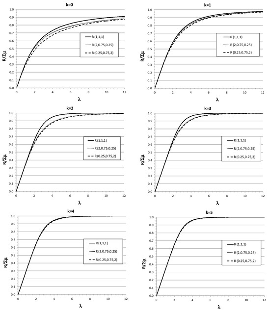 Next, the performance improvement by adding a queue was evaluated using model E for different values of the maximum queue capacity (Figure 7). For k = 0, model E was equivalent to model B. The operative curves of Figure 7 show that the size of the buffer increased the throughput, but more relevant, for heterogeneous service rates, the performance could reach higher results with imbalanced service rates arranged from slower to faster, i.e., (0.25, 0.75, 2), than the balanced distribution (1, 1, 1) since this provided a buffer of enough capacity. In the case of heterogeneous servers without any queue, ordering the servers from faster to slower gave the best results for the throughput.