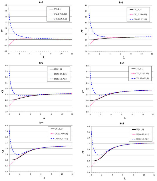 Conversely to manufacturing systems of tangible products, where the cycle time of customers in the system can be secondary after throughput, in service manufacturing or pure service systems, the sojourn time in the system can be a priority and fundamental metric. For the system under study with m = 3, multiclass servers with a buffer of maximum size k before them, the time in the system, also called the sojourn time or cycle time CT, is calculated using Little’s law (7) and is represented in Figure 8. At low λ, the better results (minimum CT) were obtained with faster-to-slower server priority, while in the rest of the range, the better configuration was the homogeneous arrangement of servers. While the queue capacity improved throughput by mitigating loss with a high offered load, it also increased CT.
