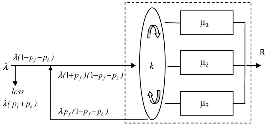 We modified model E to include a recirculation flow, as represented in Figure 9. When the conveyor recirculates the non-served arrivals, the offered load increases to include the flow recirculated in the time percentage the system is full (pf), and thus, the expected recirculated rate is λpf, and the net offered load to the system becomes λr = λ(1 + pf) instead of λ. Thus, considering the findings from model B, the loss of this net offered load will be λr (pf + pb) = λ(1 + pf) (pf + pb), but in fact, the loss of the recirculating fraction λ pf (pf + pb) does not exit the system, but it remains in recirculation; therefore, the net loss out of the system will be λ(1 + pf)(pf + pb) − λ pf (pf + pb) = λ (pf + pb), which is consistent with the net balance with the external offered load λ, which was already verified in models B and E. In consequence, the output rate is expected to be λr(1 − pf − pb) = λ(1 + pf) (1 − pf − pb). The recirculation does not generate any extra state in the transition state diagram of servers in model E (see Figure 4), but increases the offered load to the servers. In general, the probabilities pf and pb with recirculation will reach different values than those without recirculation.