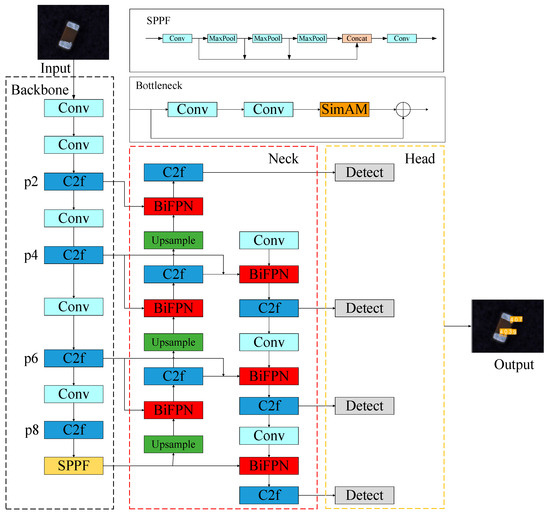 While the original YOLOv8n model boasts commendable overall performance, it exhibits certain limitations in identifying small dense defects. To surmount these challenges and enhance the model’s efficacy in pinpointing diminutive flaws in micro-capacitors, this paper introduces three significant enhancements to the YOLOv8 architecture. Figure 2 displays the enhanced network architecture. First, we integrated an attention mechanism known as the simplified attention module (SimAM) into the YOLOv8 framework. The purpose of this integration was to increase the model’s attention to smaller targets to improve its ability to identify and categorize critical minor flaws during micro-capacitor inspections. Second, the model’s multi-scale information fusion was improved by BiFPN combined with the p2 layer, which also increases the accuracy of small target detection. Lastly, the WISE-IOU [12,25] loss function replaced the traditional CIoU loss function. The purpose of this modification was to focus the model’s attention on higher-quality, representative examples. WISE-IOU adoption greatly strengthened the model’s capacity for generalization, which in turn improved the model’s robustness and performance in a variety of detection scenarios.